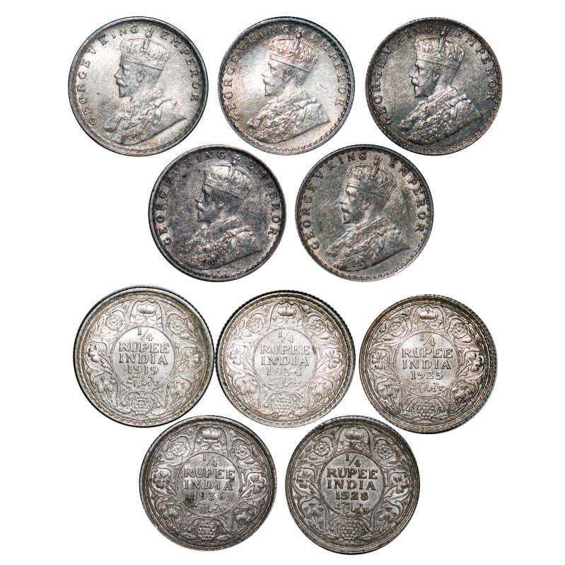 | George V, Silver, 1/4 Rupee, (5 coins), 1) 1919, Calcutta Mint, No dot, 2) 1925, Bombay Mint, Dot, 3) 1928, Bombay Mint, Dot, 4) 1934, Calcutta Mint, No dot, 5) 1936, Bombay Mint, Dot. F. Prid. 448, 458, 459, 452, 460. GK 1092, 1093, 1095, 1098, 1100. Very Fine+ to Uncirculated. Scarce as a lot. |