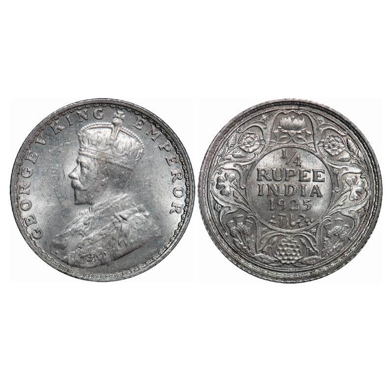 George V, Silver, 1/4 Rupee, 1925, Bombay Mint, Dot. F. Prid 458. GK 1093. Brilliant Uncirculated. Rare.