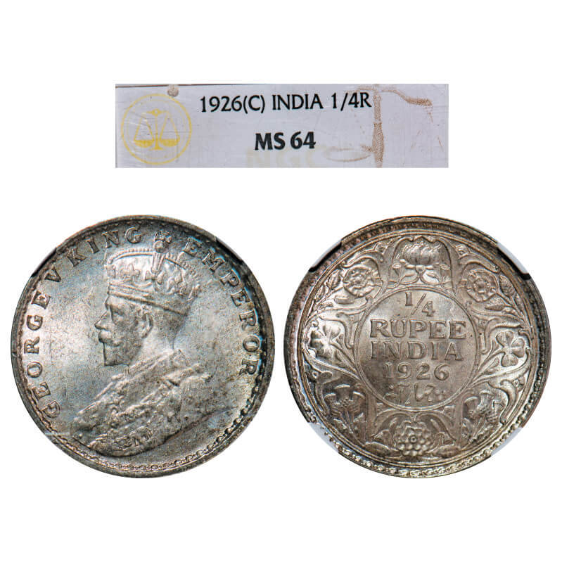 George V, Silver, 1/4 Rupee, 1926, Calcutta Mint, No dot. F. Prid 449. GK 1094. NGC Slabbed MS 64. Very Rare.