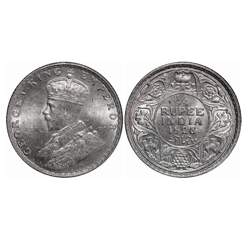 George V, Silver, 1/4 Rupee, 1928, Bombay Mint, Dot. F. Prid 459. GK 1095. Mint Grade. Rare.