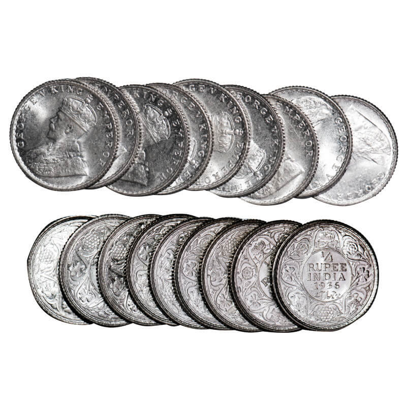 George V, Silver, 1/4 Rupee, 1936, (lot of 9 coins), Bombay Mint, Dot. F. Prid 460. GK 1100. Brilliant Uncirculated. Scarce as a lot.