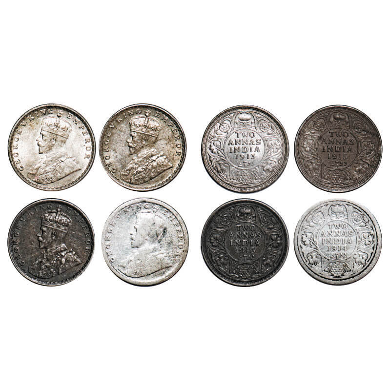 | George V, Silver, 2 Annas, (4 coins), 1) 1913, Calcutta Mint, No dot, 2) 1914, Bombay Mint, dot, 3 & 4) 1915, Bombay Mint, Dot. F. Prid 566, 573, 574. GK 1110, 1113, 1115(2). Fine to Almost Uncirculated. Scarce. |