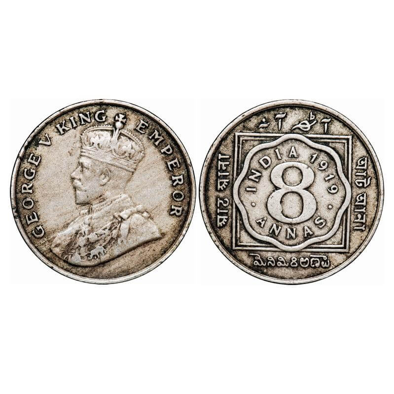 George V, Copper-Nickel, 8 Annas, 1919, Calcutta Mint, No dot. F. Prid 870. GK 1077. Extremely Fine. Scarce.