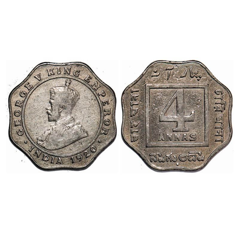 George V, Copper-Nickel, 4 Annas, 1920, Bombay Mint, Dot. F. Prid 878. GK 1104. Very Fine+. Scarce.