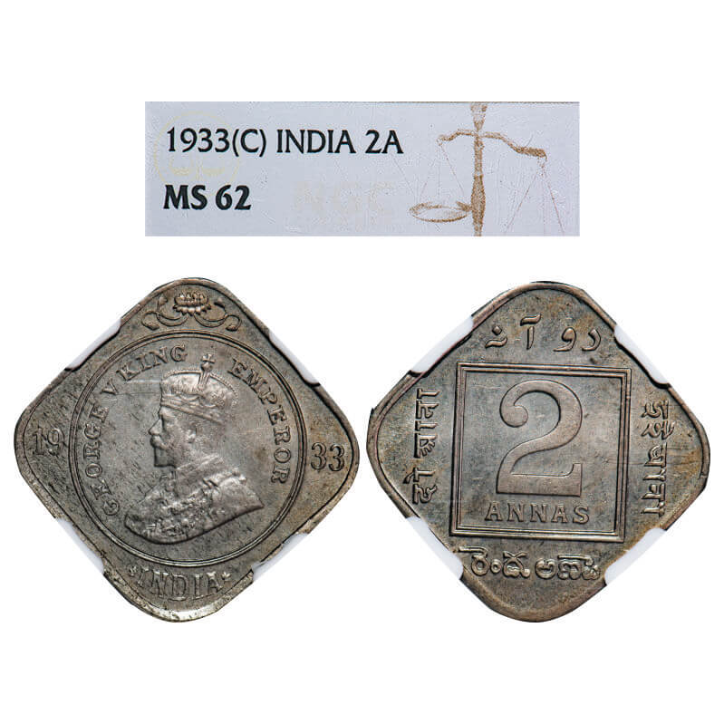 George V, Copper-Nickel, 2 Annas, 1933, Calcutta Mint, No dot. F. Prid. 891. GK 1136. NGC Slabbed MS 62. Rare.