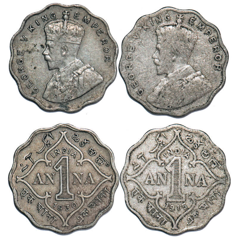 | George V, Copper-Nickel, 1 Anna, (2 coins), 1) 1915, Bombay Mint, No dot, 2) 1930, Calcutta Mint, No dot. F. Prid 945, 936. GK 1145, 1163. Very Fine to Very Fine+. Scarce. |