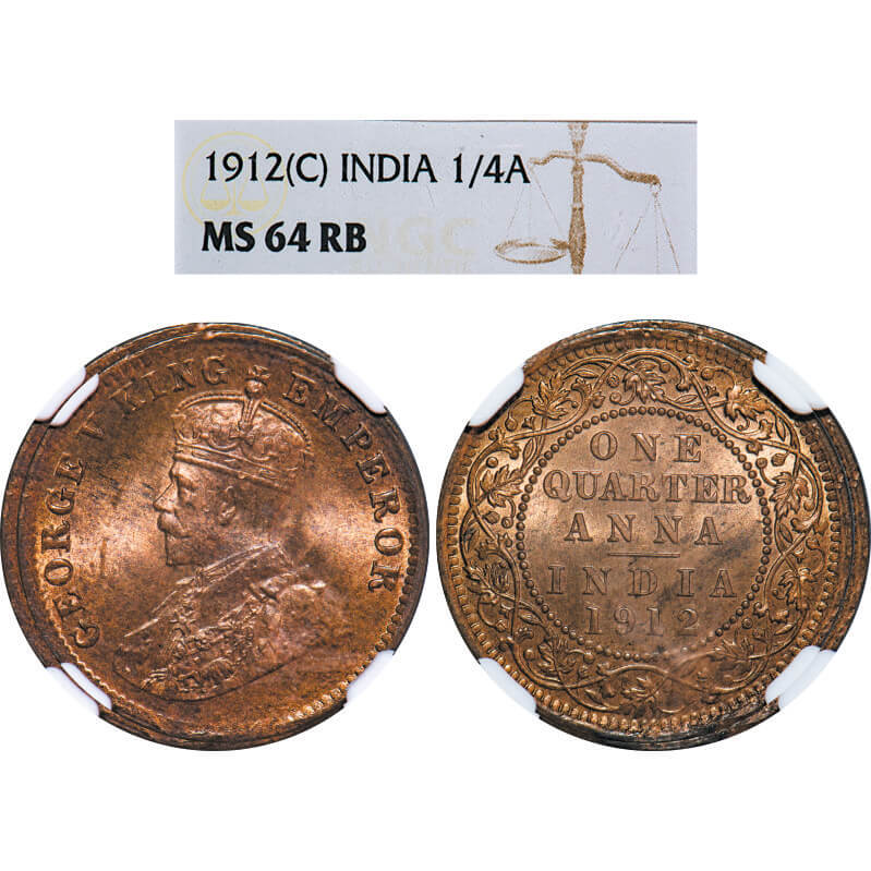 George V, Bronze, Quarter Anna, 1912, Calcutta Mint, No dot. F. Prid. 658. GK 1172. NGC Slabbed MS 64 RB. Rare.