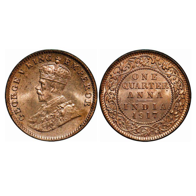 George V, Bronze, Quarter Anna, 1917, Calcutta Mint, No dot. F. Prid 662. GK 1176. Brilliant Uncirculted. Very Scarce.