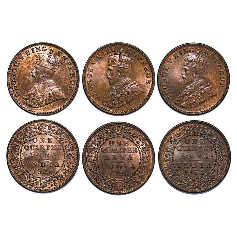| George V, Bronze, Quarter Anna, (3 coins), 1) 1926, Bombay Mint, Dot, 2) 1929, Calcutta Mint, No dot, 3) 1934, Calcutta Mint, No dot. F. Prid 679, 670, 674. GK 1183, 1189, 1194. Uncirculated. Scarce. |