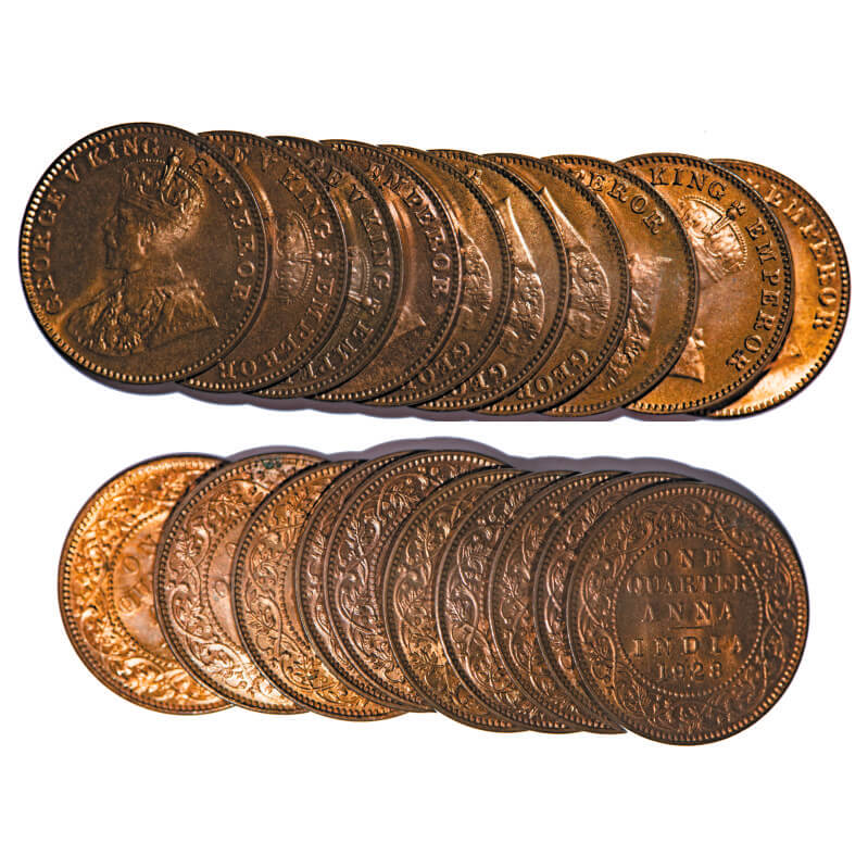 George V, Bronze, Quarter Anna, 1928, (lot of 10 coins), Bombay Mint, Dot. F. Prid 681. GK 1187. Brilliant Uncirculated. Scarce as a lot.