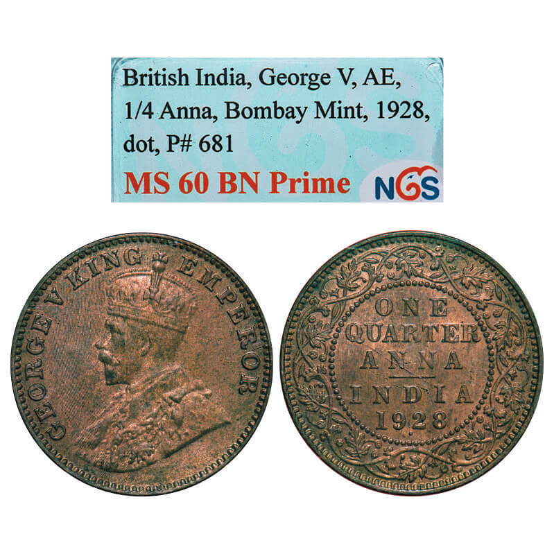 George V, Bronze, Quarter Anna, 1928, Bombay Mint, Dot. F. Prid. 681. GK 1187. NGS Slabbed MS 60 BN. Scarce.