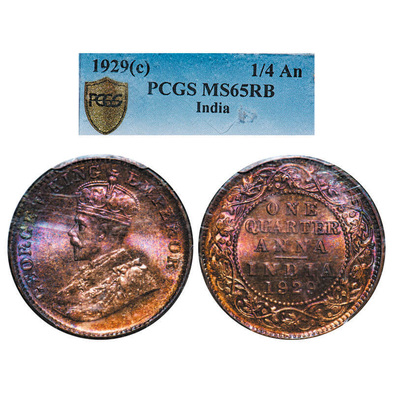 George V, Bronze, Quarter Anna, 1929, Calcutta Mint, No dot. F. Prid 670. GK 1189. PCGS Slabbed MS 65 RB. Rare.