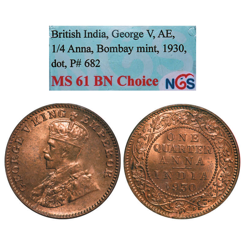 George V, Bronze, Quarter Anna, 1930, Bombay Mint, Dot. F. Prid. 671. GK 1190. NGS Slabbed MS 61 BN Choice. Scarce.