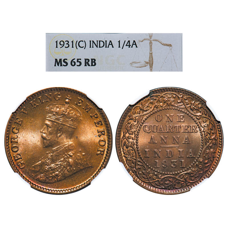 George V, Bronze, Quarter Anna, 1931, Calcutta Mint, No dot. F. Prid 672. GK 1192. NGC Slabbed MS 65 RB. Very Rare.