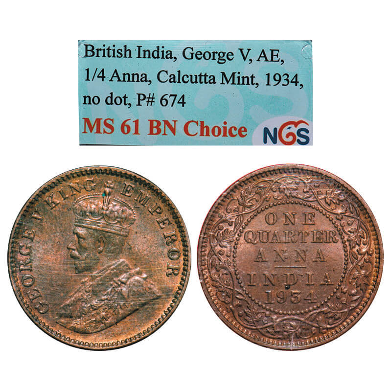 George V, Bronze, Quarter Anna, 1934, Calcutta Mint, No dot. F. Prid. 674. GK 1194. NGS Slabbed MS 61 BN Choice. Scarce.