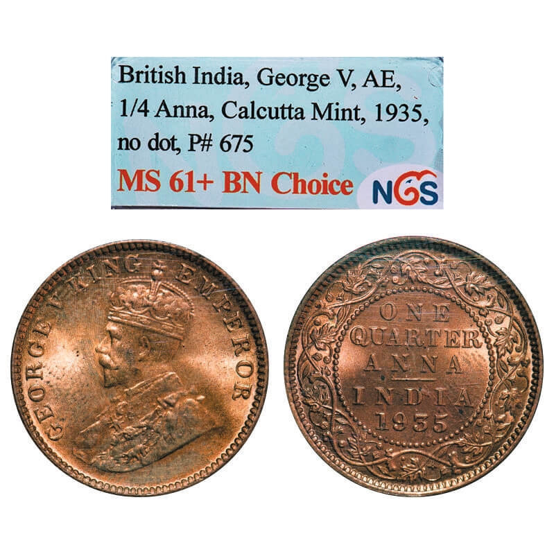 George V, Bronze, Quarter Anna, 1935, Calcutta Mint, No dot. F. Prid. 675. GK 1195. NGS Slabbed MS 61+ BN Choice. Scarce.