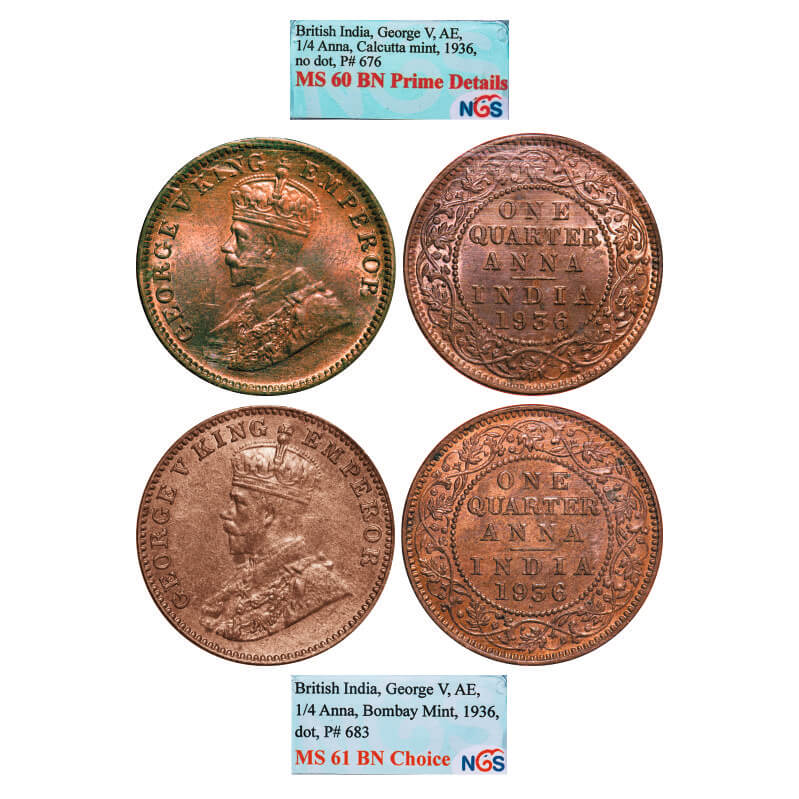 | George V, Bronze, Quarter Anna, 1936, (2 slabs), 1) Bombay Mint, Dot, 2) Calcutta Mint, No dot. F. Prid. 683, 676. GK 1196, 1197. NGS Slabbed MS 60 BN Prime, MS 61 BN Choice. Scarce. |