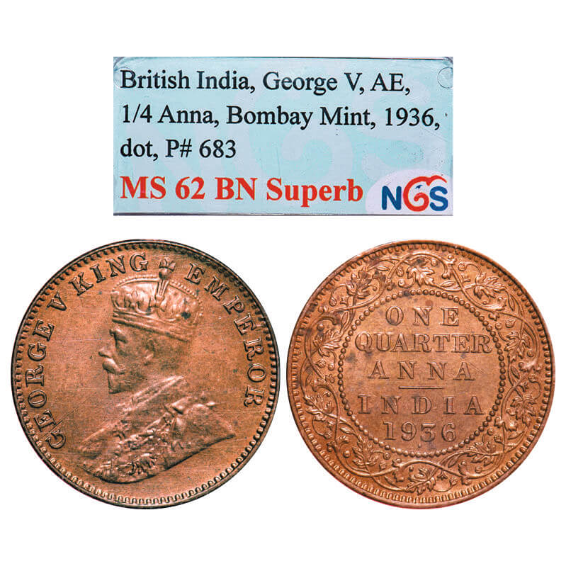 George V, Bronze, Quarter Anna, 1936, Bombay Mint, Dot. F. Prid. 683. GK 1196. NGS Slabbed MS 62 BN Superb. Very Scarce.