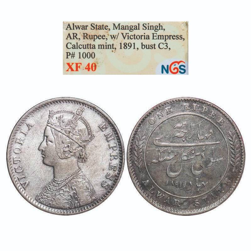 Alwar, Silver Rupee, Mangal Singh (1874-1892 AD), Calcutta Mint, AH 1891, Portrait of Victoria Empress, Milled coinage. KM 45, NGS Slabbbed XF 40. Scarce.