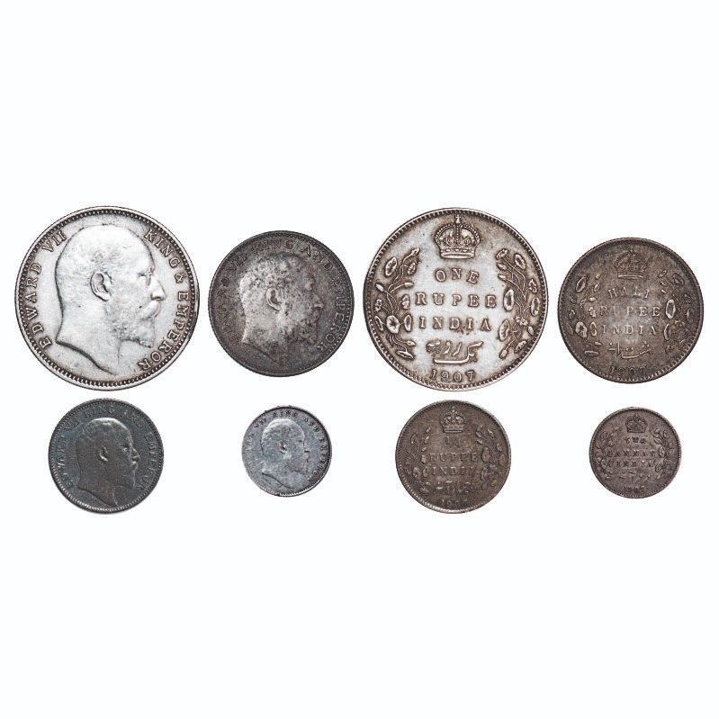 | Edward VII, Silver, 1907, (4 coins), 1) Rupee, Bombay Mint, 'B' incused and dot, 2) Half Rupee, Bombay Mint, 'B' incused and dot, 3) 1/4 Rupee, Calcutta Mint, No mint mark, 4) 2 Annas, Calcutta Mint, No mint mark. F. Prid 203, 316, 436, 560. GK 944, 965, 976, 984. Very Fine to Extremely Fine. Scarce. |
