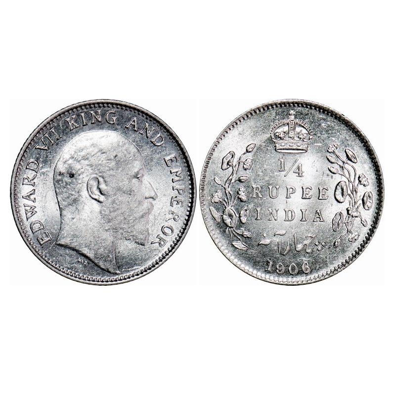 Edward VII, Silver, 1/4 Rupee, 1906, Calcutta Mint, No mint mark. F. Prid 435. GK 975. Brilliant Uncirculated. Rare.
