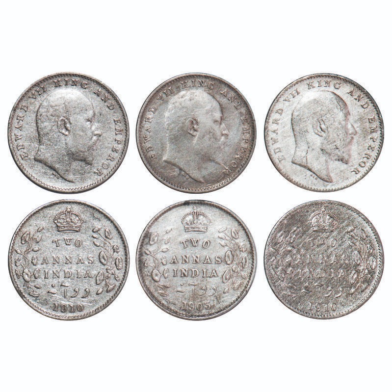 | Edward VII, Silver, 2 Annas, (3 coins), 1) 1903, Calcutta Mint, No mint mark, 2) 1910, Calcutta Mint, No mint mark, 3) 1910, Bombay Mint, Dot. F. Prid 556, 563, 559. GK 980, 987, 983. Very Fine to Very Fine+. Very Scarce. |