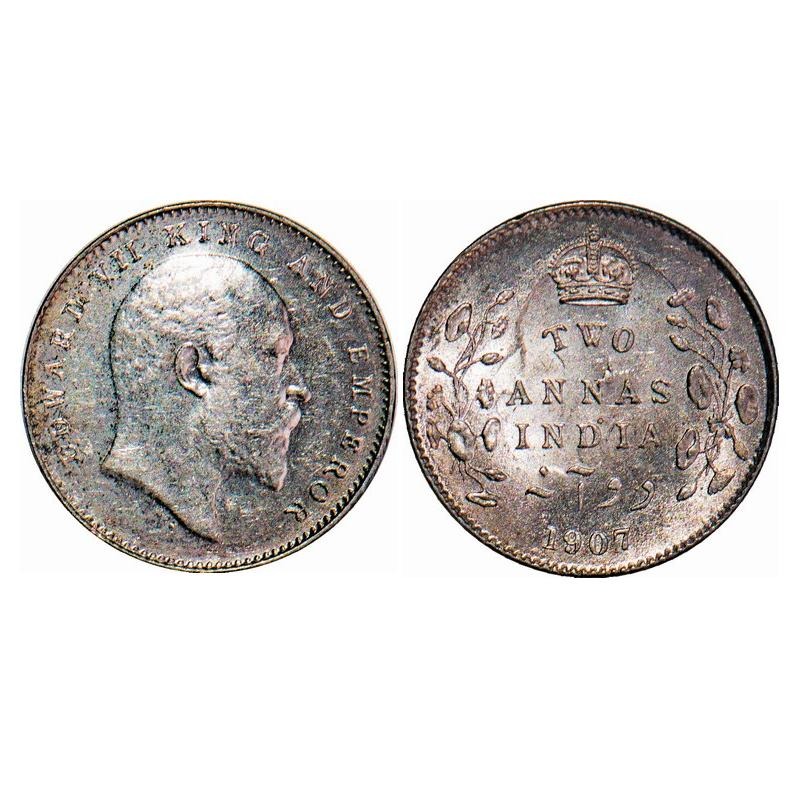 Edward VII, Silver, 2 Annas, 1907, Calcutta Mint, No mint mark, Ghost on Rev. F. Prid 560. GK 984. Brilliant Uncirculated. Scarce.