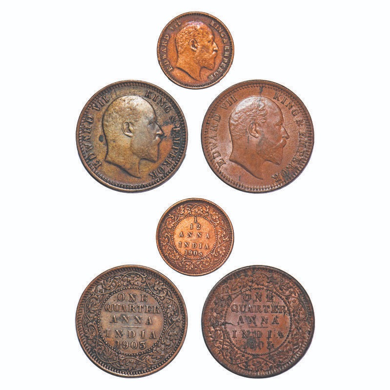 | Edward VII, Copper, (3 coins), 1 & 2) Quarter Anna, 1903, Calcutta Mint, No mint mark, 3) 1/12 Anna, 1905, Calcutta Mint, No mint mark. F. Prid 646(2), 820. GK 994 (2), 1014. Very Fine to About Uncirculated. Scarce. |
