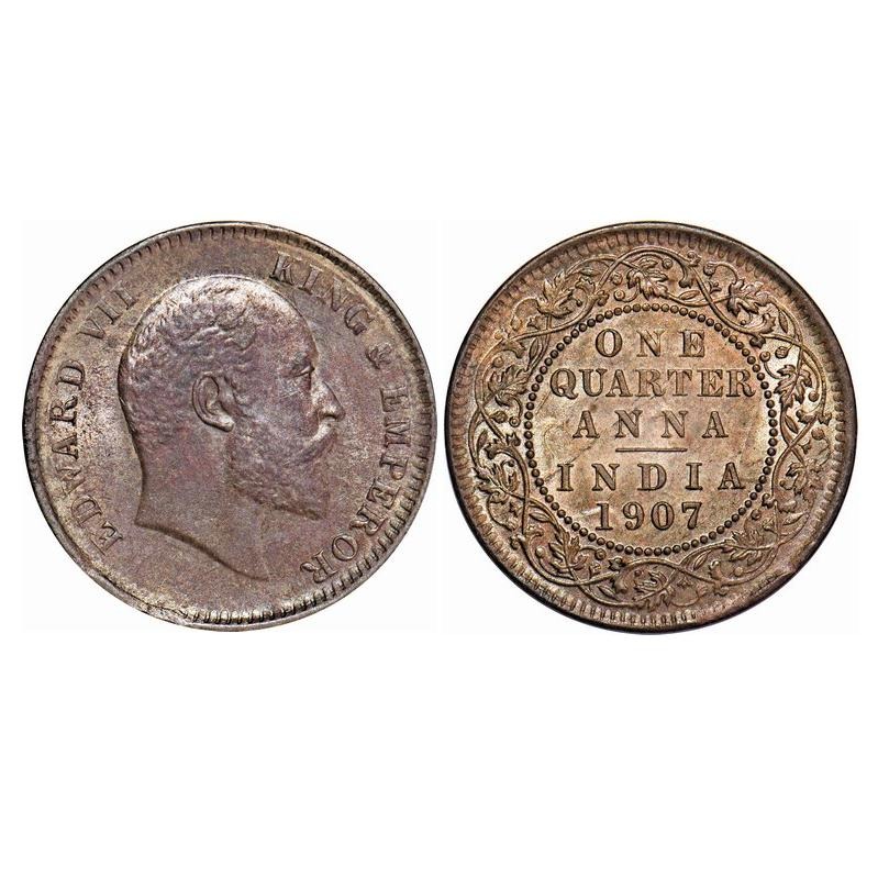 Edward VII, Bronze, Quarter Anna, 1907, Calcutta Mint, No mint mark. F. Prid 652. GK 999. Uncircula...