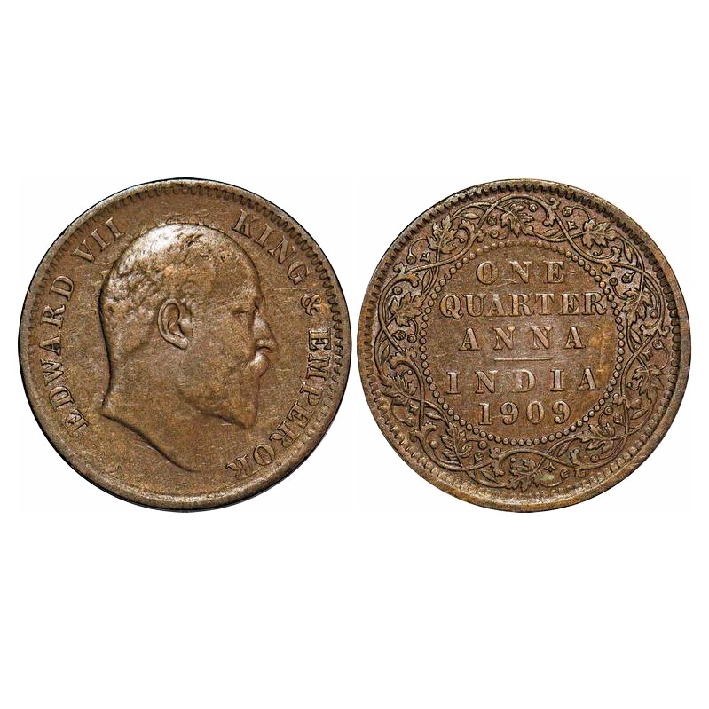 Edward VII, Bronze, Quarter Anna, 1909, Calcutta Mint, No mint mark. F. Prid 654. GK 1001. Very Fine+. Scarce.