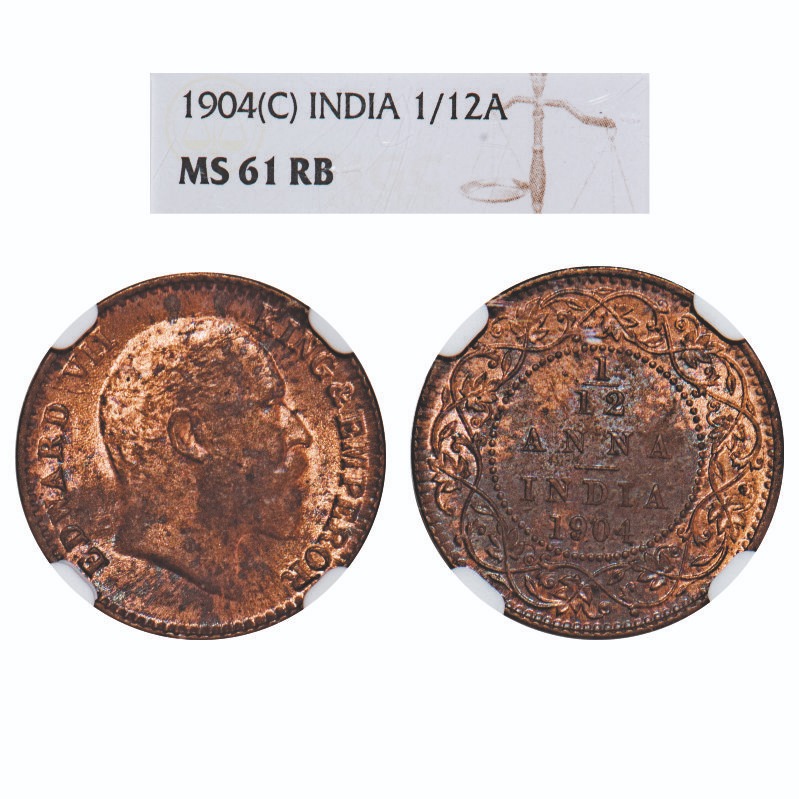 Edward VII, Copper, 1/12 Anna, 1904, Calcutta Mint, No mint mark. F. Prid 814. GK 1013. NGC Slabbed MS 61 RB. Very Scarce.