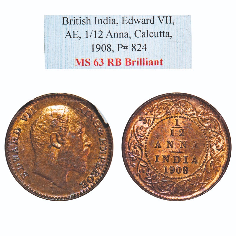 Edward VII, Bronze, 1/12 Anna, 1908, Calcutta Mint, No mint mark. F. Prid 824. GK 1018. NGS Slabbed MS 63 RB Brilliant. Rare.