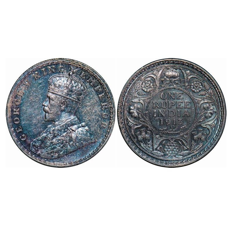 George V, Silver, Rupee, 1913, Bombay Mint, Dot. F. Prid 219. GK 1028. Brilliant Uncirculated, Rainbow toned. Very Scarce.