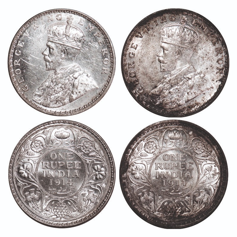 | George V, Silver, Rupee, (2 coins), 1914, 1) Calcutta Mint, No dot, 2) Bombay Mint, Dot. F. Prid 210, 220. GK 1029, 1030. Mint State. Very Scarce. |