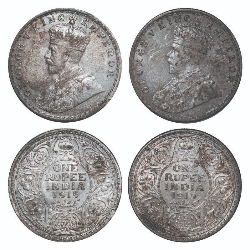 | George V, Silver, Rupee, (2 coins), 1915, 1) Calcutta Mint, No dot, 2) Bombay Mint, Dot. F. Prid 211, 221. GK 1031, 1032. Extremely Fine to Extremely Fine+. Scarce. |