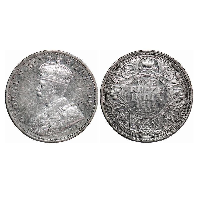 George V, Silver, Rupee, (lot of 5 coins), 1) 1915, Calcutta Mint, No dot, 2) 1916, Bombay Mint, Do...
