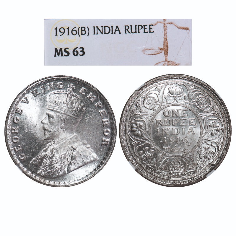 George V, Silver, Rupee, 1916, Bombay Mint, Dot. F. Prid 222. GK 1034. NGC Slabbed MS 63. Very Rare.