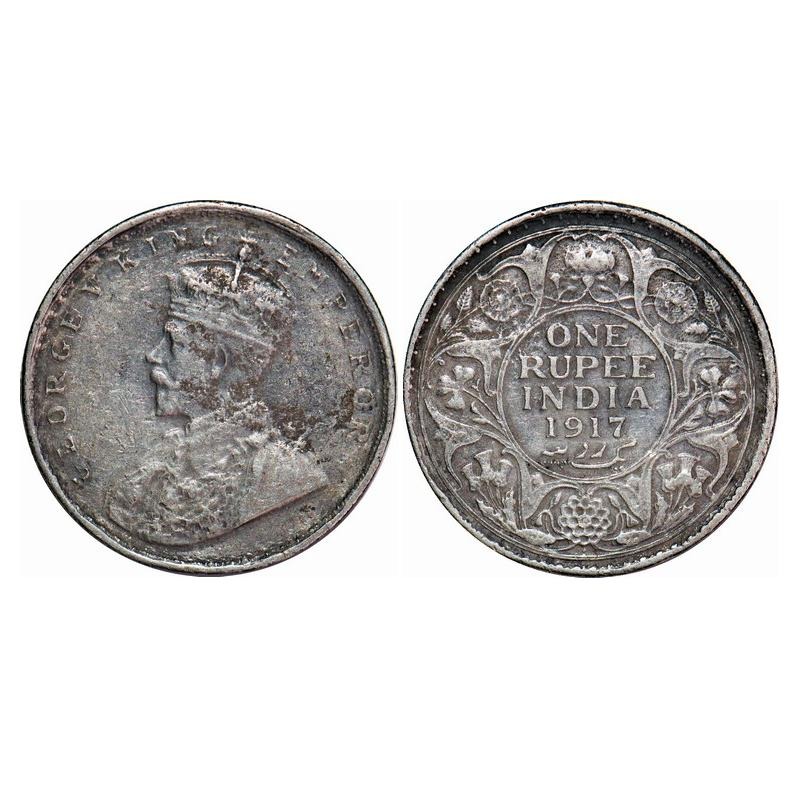 | George V, Silver, Rupee, 1917, Bombay Mint, Dot, Error, Crudish lettering on Obv, Few alphabates on Obv are double struck. F. Prid 223. GK 1036. Very Fine. Rare. |