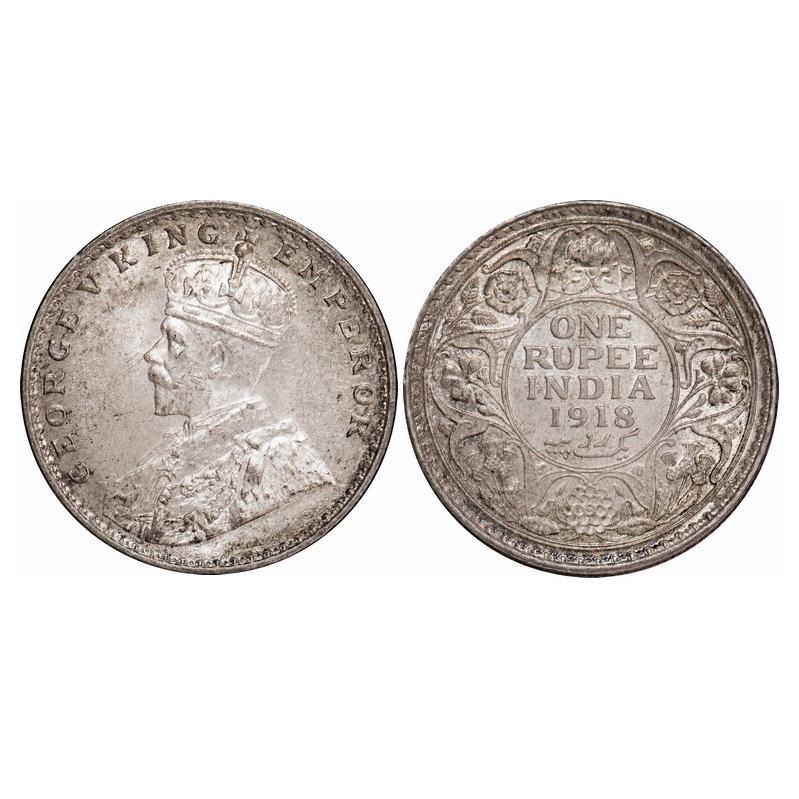 George V, Silver, Rupee, 1918, Calcutta Mint, No dot, Raised initials 'B M' Bertram Mackennal on the truncation on the Kings shoulder. F. Prid 214. GK 1037. Mint Grade, Toned. Very Scarce.