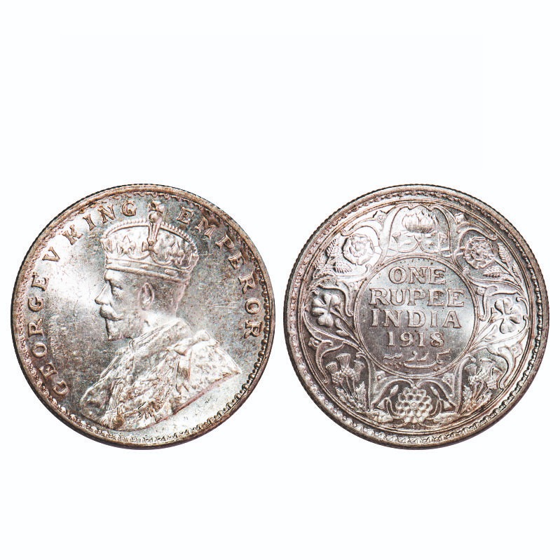 George V, Silver, Rupee, 1918, Bombay Mint, Dot, Complete skull ghost on Rev, alphabate 'R' and 'E'...
