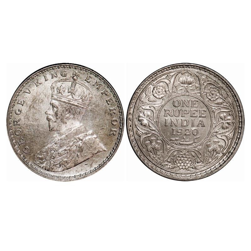 George V, Silver, Rupee, 1920, Calcutta Mint, N0 dot, Ghost on Rev. F. Prid 216. GK 1041. Mint Grades with original mint luster. Very Scarce.