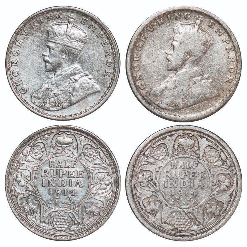 | George V, Silver, Half Rupee, (2 coins), 1914, 1) Calcutta Mint, No dot, 2) Bombay Mint, Dot. F. Prid 321, 338. GK 1050, 1051. Fine to Extremely Fine+. Scarce. |