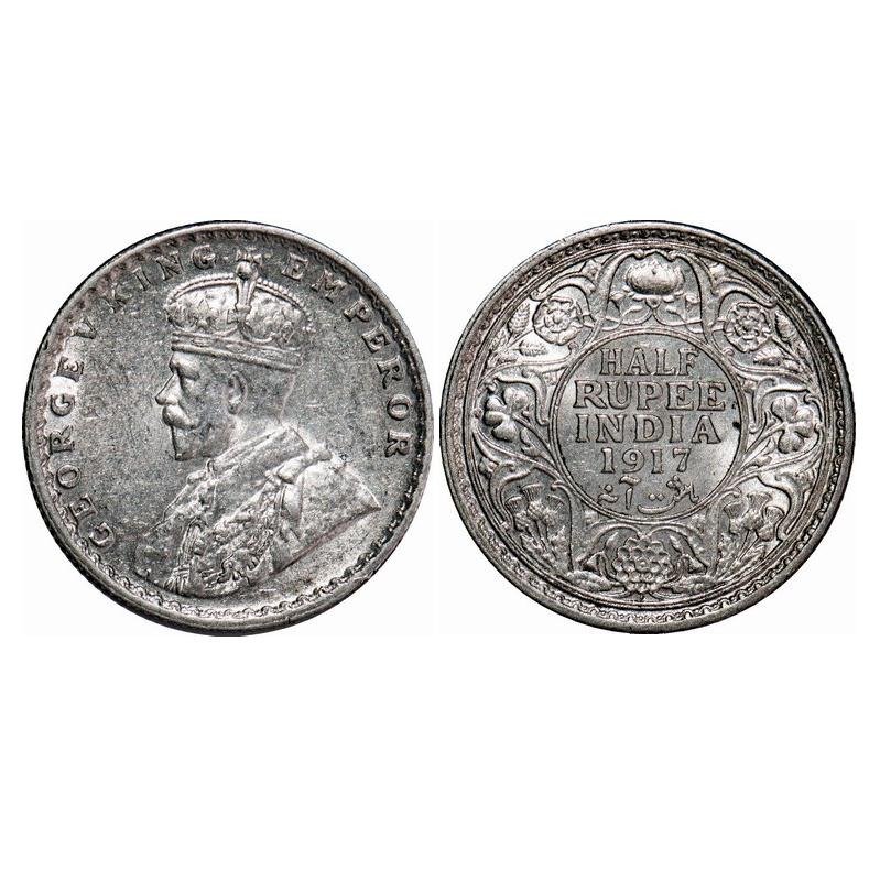 George V, Silver, Half Rupee, 1917, Bombay Mint, Dot. F. Prid 341. GK 1055. Uncirculated. Very Scar...