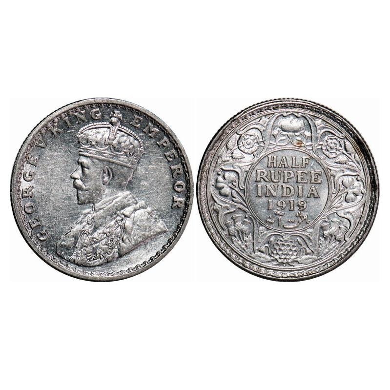 George V, Silver, Half Rupee, 1919, Bombay Mint, No dot. F. Prid 343. GK 1057. Brilliant Uncirculat...