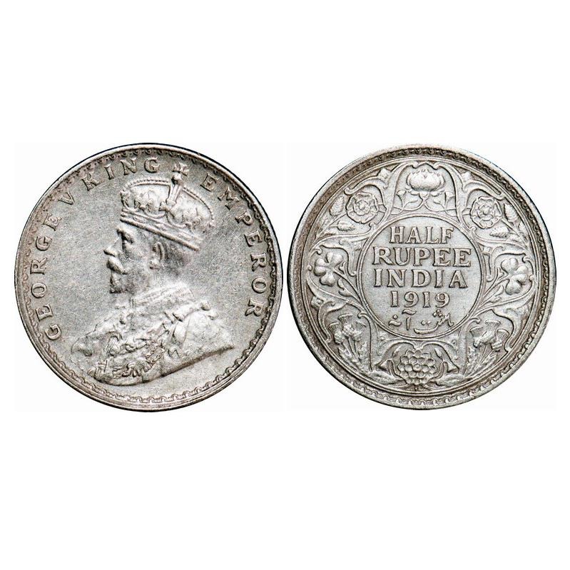 George V, Silver, Half Rupee, 1919, Bombay Mint, No dot. F. Prid 343. GK 1057. Brilliant Uncirculat...