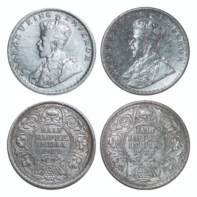 | George V, Silver, Half Rupee, (2 coins), 1922, 1) Calcutta Mint, No dot, 2) Bombay Mint, Dot. F. Prid 325, 344. GK 1059, 1060. Very Fine+ to Extremely Fine+. Scarce. |