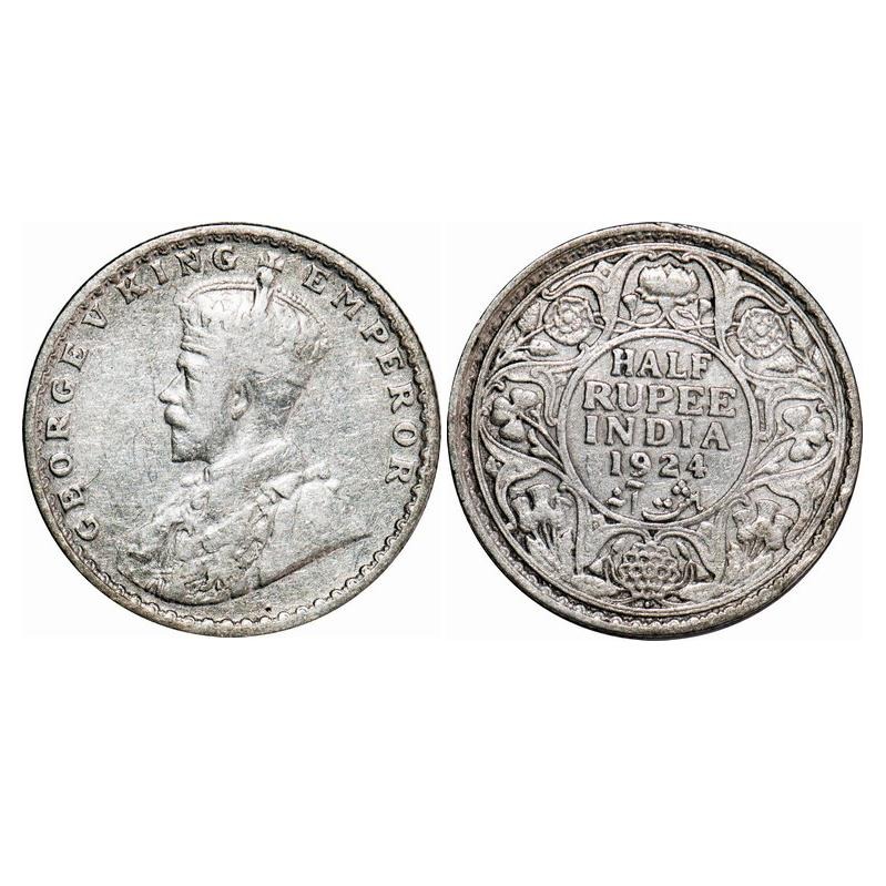 George V, Silver, Half Rupee, (2 coins), 1924, 1) Calcutta Mint, No dot, 2) Bombay Mint, Dot. F. Pr...