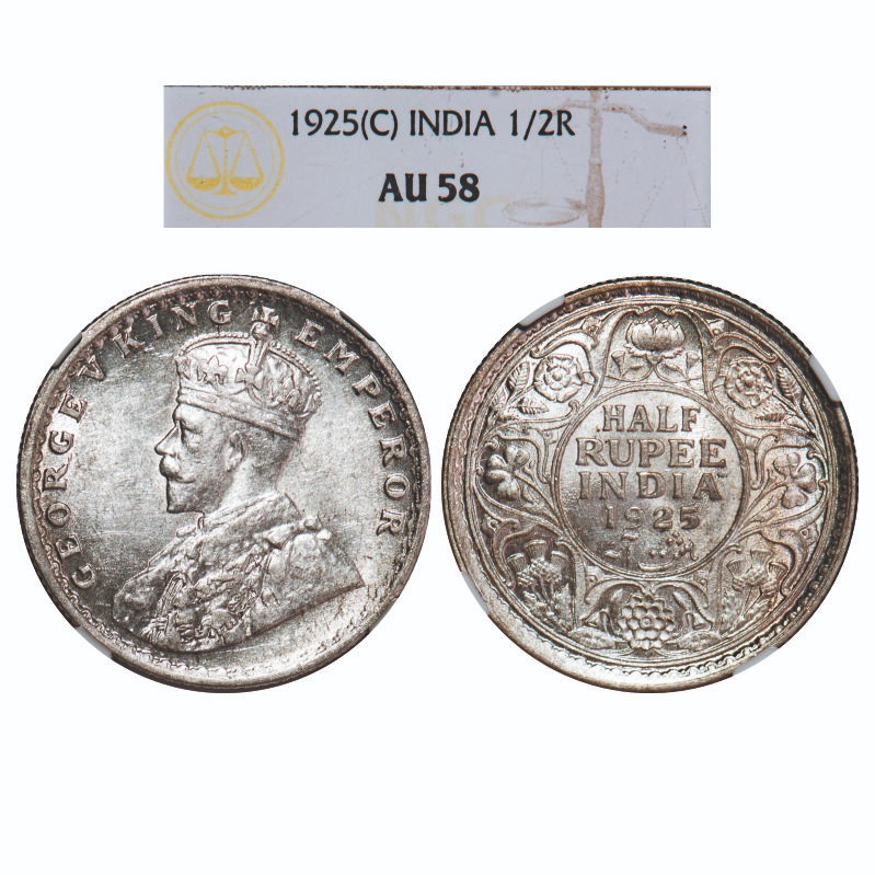 George V, Silver, Half Rupee, 1925, Calcutta Mint, No dot. F. Prid 328. GK 1065. NGC Slabbed AU 58. Scarce.