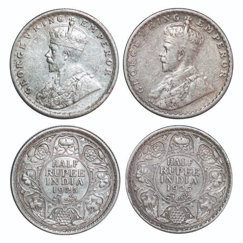 | George V, Silver, Half Rupee, (2 coins), 1925, 1) Calcutta Mint, No dot, 2) Bombay Mint, Dot. F. Prid 328, 347. GK 1065, 1066. About Very Fine to Very Fine+. Scarce. |