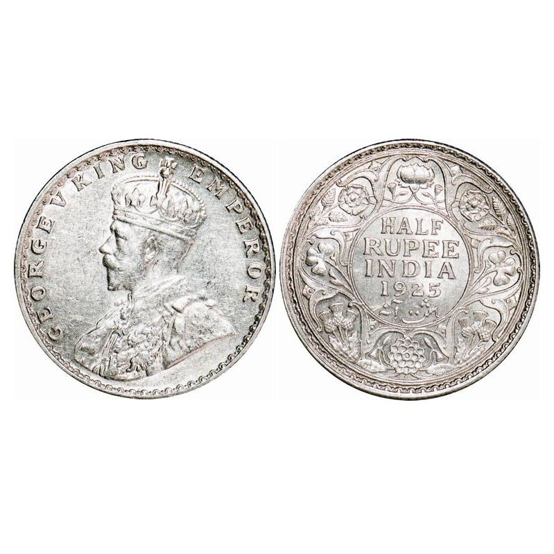 George V, Silver, Half Rupee, (2 coins), 1925, 1) Calcutta Mint, No dot, 2) Bombay Mint, Dot. F. Pr...